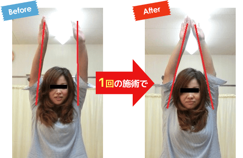 腕を高く上げようとしても、ツッパリ感が強く耳の前までで止まってしまっていたKさん。施術後は腕が耳の後ろまで上がるようになりツッパリ感もなくなりました。
